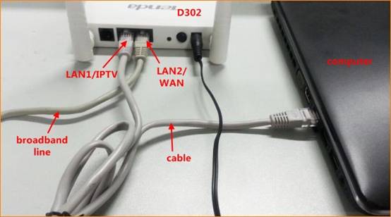 Connect the broadband line with the LAN/WAN port of D302, and then connect your computer with IPTV port of D302 by a cable.