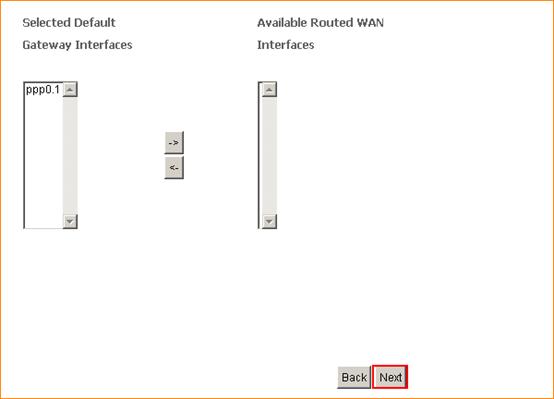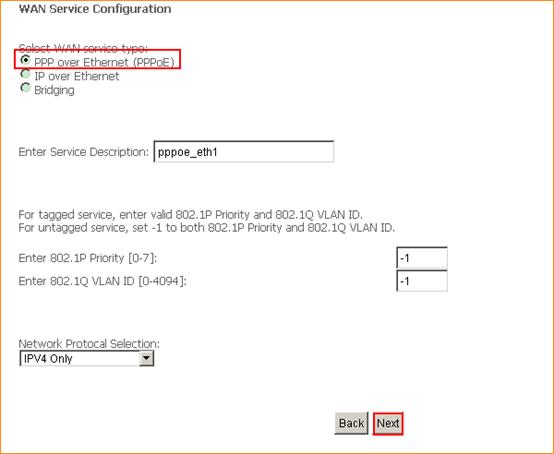 3.2.3 Click WAN Service and Add, keep the eth1/eth1 and click Next, then choose PPP over Ethernet (PPPoE) and click Next, please type in user name and password (you can consult your ISP for it if you don’t know).Click Next and click Apply/Save.