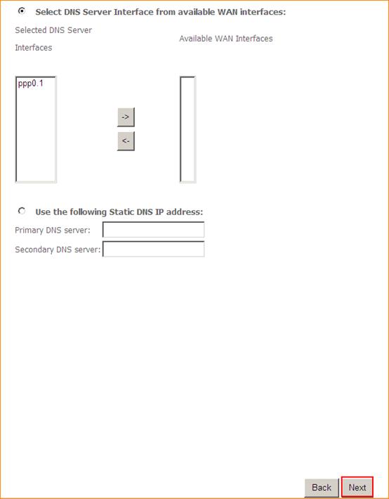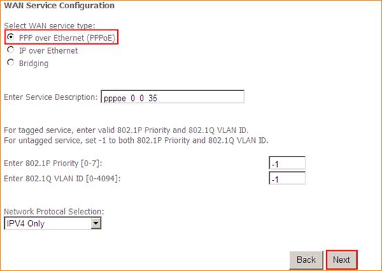 3.2.3 Click WAN Service and Add, keep the atm0 and click Next, then choose PPP over Ethernet (PPPoE) and click Next, please type in user name and password (you can consult your ISP for it if you don’t know).Click Next and click Apply/Save.