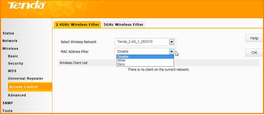 MAC Address Filter: Select Allow or Deny from the drop-down list.