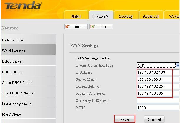 4.Click on Network, then click on WAN Settings, then choose Static IP as Internet Connection Type and input the information.