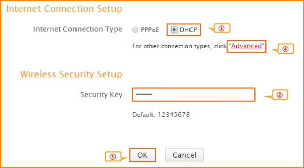 3.1.2 Choose the DHCP option, then set for the wireless security, click on ok to save the settings, then click on Advanced.
