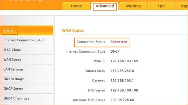 4.1 Click on Advanced to login the advanced setting page, then check the Status if the Connection Status shows Connected that means you can access internet, please check.