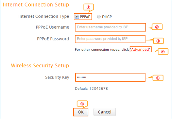 3.1.2 Choose the PPPoE option and then please type in user name and password (you can consult your ISP for it if you don’t know). Then set for the wireless security, click on OK to save the settings, then click on Advanced.
