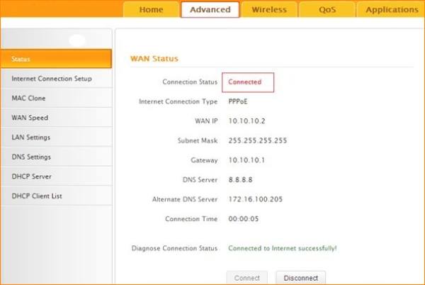 4.1 Click on Advanced to login the advanced setting page, then check the Status if the Connection Status shows Connected that means you can access internet, please check.