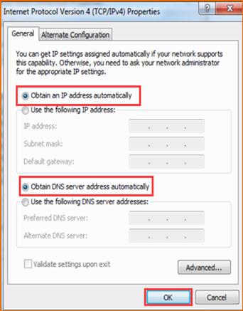 5. Select Obtain an IP address automatically and Obtain DNS server address automatically and click OK