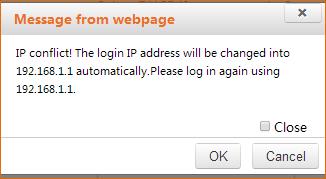 NoticeIf the prompt below appears, it indicates that the Router’s login IP and the WAN IP are in the same segment. In this case, the newly-added router’s login IP will be automatically changed into the IP address mentioned in the prompt. Just click OK.