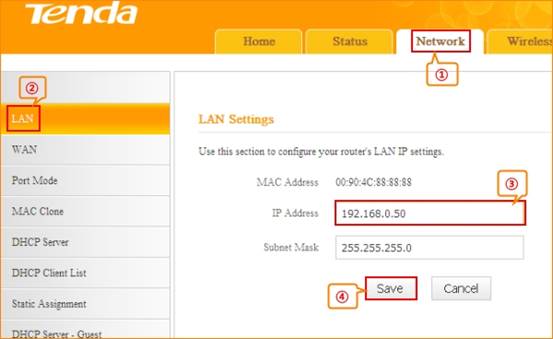 1. Click Network, and then click LAN. Change your router’s LAN IP.(The LAN IP address should be different. For example, the uplink router has the LAN IP 192.168.0.1, then you can set the secondary router’s LAN IP as 192.168.0.50)