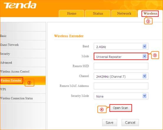 1. Click Wireless and then choose Wireless Extender, choose Universal Repeater mode. Click Open Scan.
