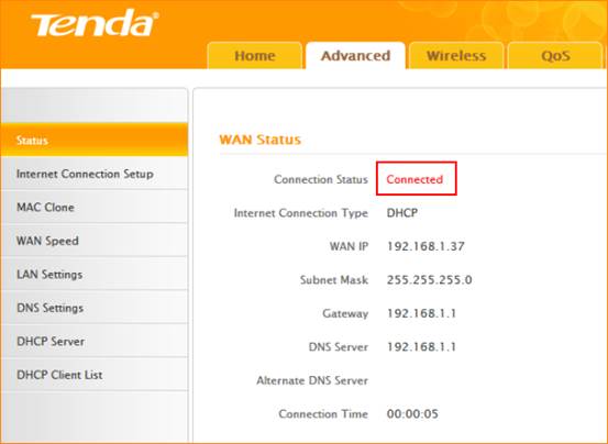 3.After reboot, if the connection status shows connected and get the gateway of uplink router, it means that you can have internet.