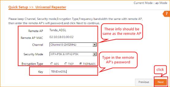 3 Confirm the remote AP’s info and type in thesecurity keyof the remote router. Then clickNext.
