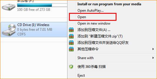 1.Open the icon named “computer” or “my computer” or “this computer” on the computer desktop, find the “CD Drive Wireless”, right click it and then select “Open”;