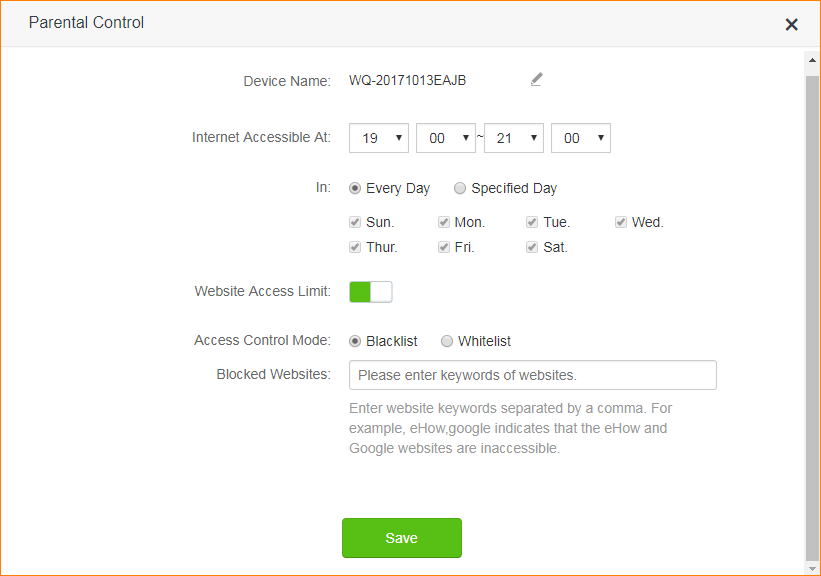 Website Access Limit: blacklist specifies what websites are unavailable. Whitelist specifies what websites are available.