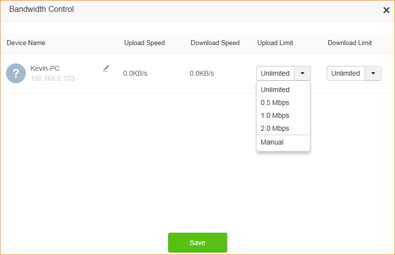 According to the bandwidth and your need, select the device that you want to control, then set the upload speed and download speed.