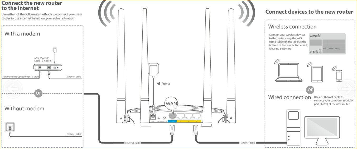 Step 1:Plug ethernet cable into WAN port. Connect PC with LAN port or use PC or mobile device to connect router WiFi signal.