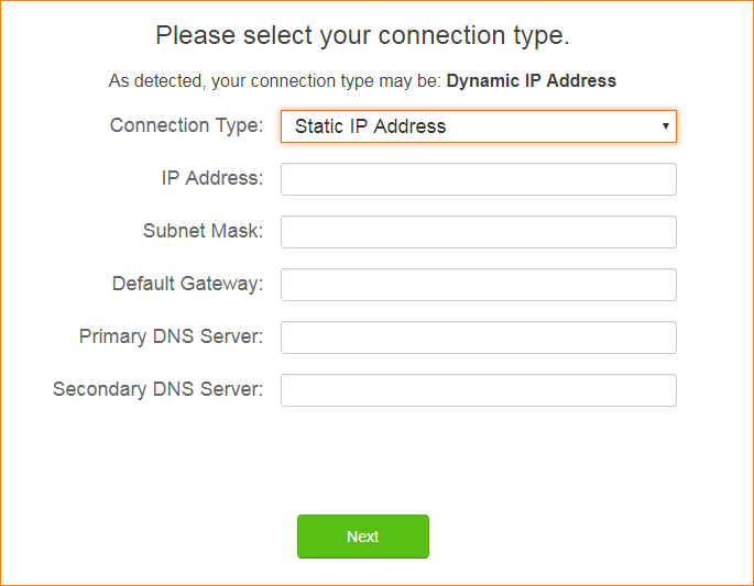 Case 3: If your connection type is Static IP Address. Please enter the information. And tap “Next”.