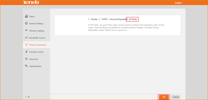Step 3: Go to Wireless repeating-> Click “AP Mode”, and click “OK” to save all the settings