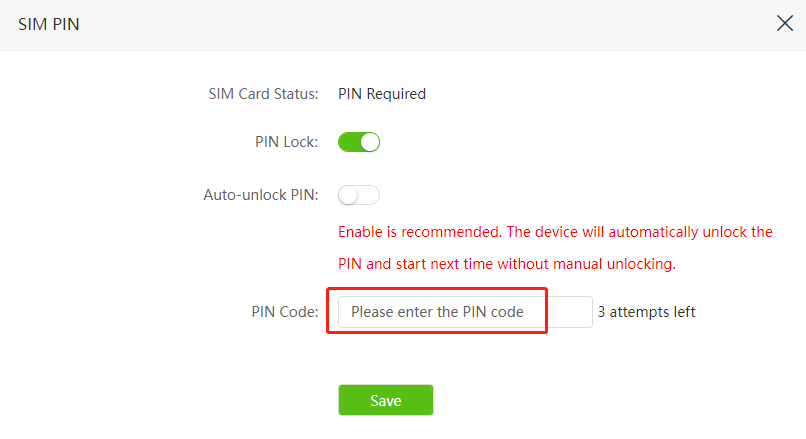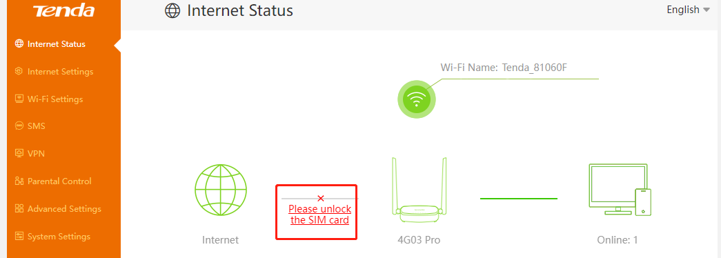 The phenomenon can be that a SIM card has been detected but Network Type shows “Connection failed”on the Internet Status page.