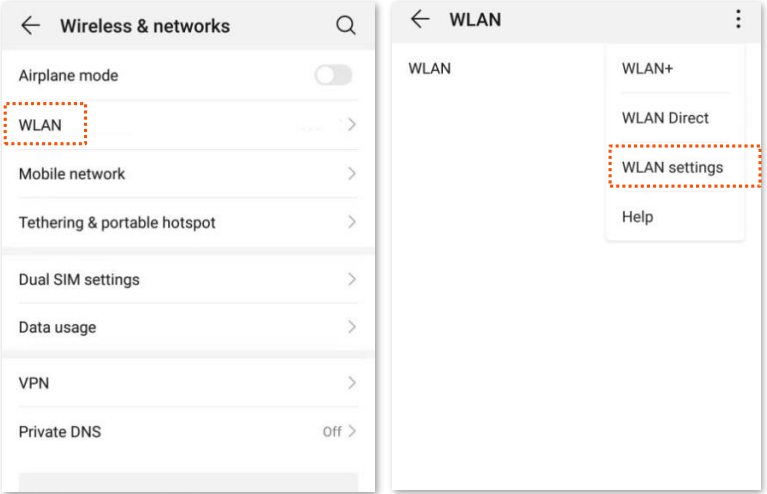 a. Find WLAN settings on your phone. b. Tap , and choose WLAN settings.