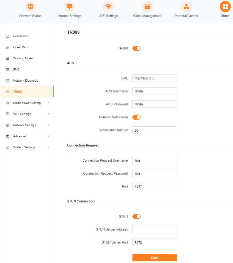 This function is disabled by default, and you can enable it as required. To access the configuration page, Log in to the web UI of the router and choose More > TR069.