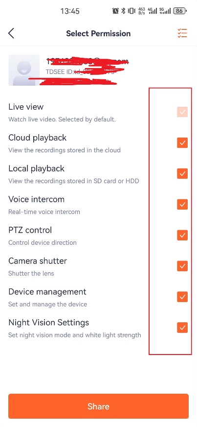 TDESEE supports sharing the device bound to the main account with friends. The main account can freely choose certain permissions to give to the shared account.