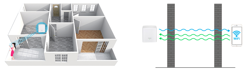 Nova MW3 Mesh Wi-Fi system is fully occupied with MRC and beamforming technology. Nova MW3 projects a stronger Wi-Fi signal in a direction where your devices are located. Instead of just broadcasting signal to wide areas, Tenda Nova MW3 Beamforming concentrates the signal and aims it directly at the target device.