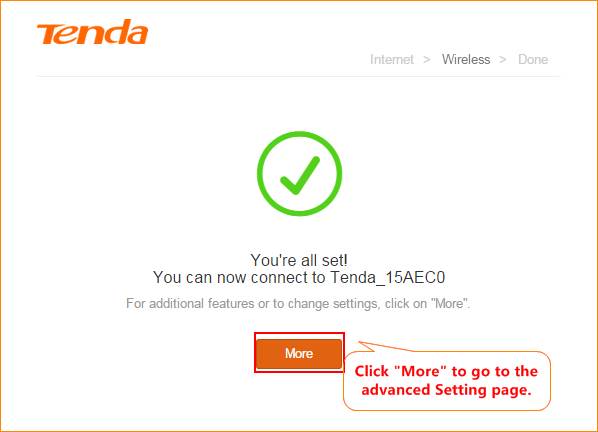 5.When the following page appears, it indicates that you can access the Internetnow. If you want to experience more features, click More to log in to theRouter’s user Interface.