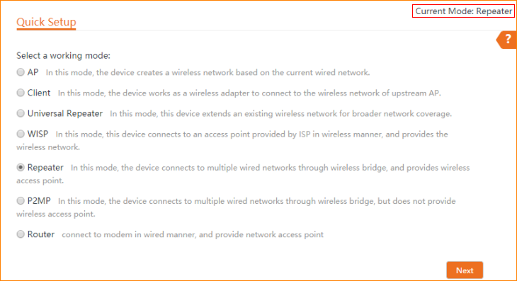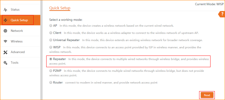 3.1 Click “Quick setup”, select “Repeater”, and then click “Next”.