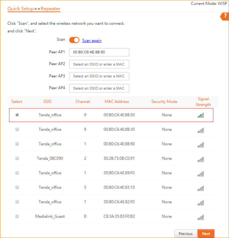 3.2 Click "Scan", and select the wireless network you want to connect, and then click "Next".