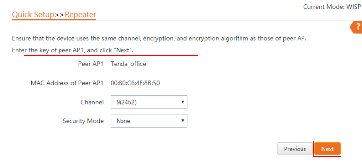 3.3 Ensure that the device uses the same channel, encryption, and encryption algorithm as those of peer AP. Enter the key of peer AP1, and click "Next".