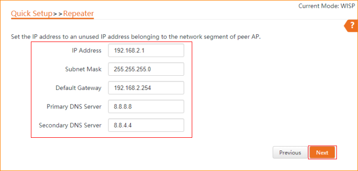 3.4 Set the IP address to an unused IP address belonging to the network segment of peer AP.