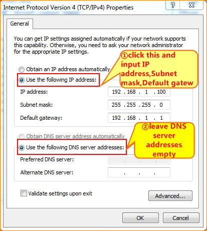 5 Choose Use the following IP address and Obtain DNS server address automatically and then click OK.( The D152 default settings close DHCP in Bridging mode ,so we setup IP address for computer.)