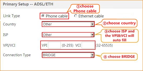 3.1.3 choose Phone cableCountry and ISP. The connection type is BRIDGE, and then click OK.