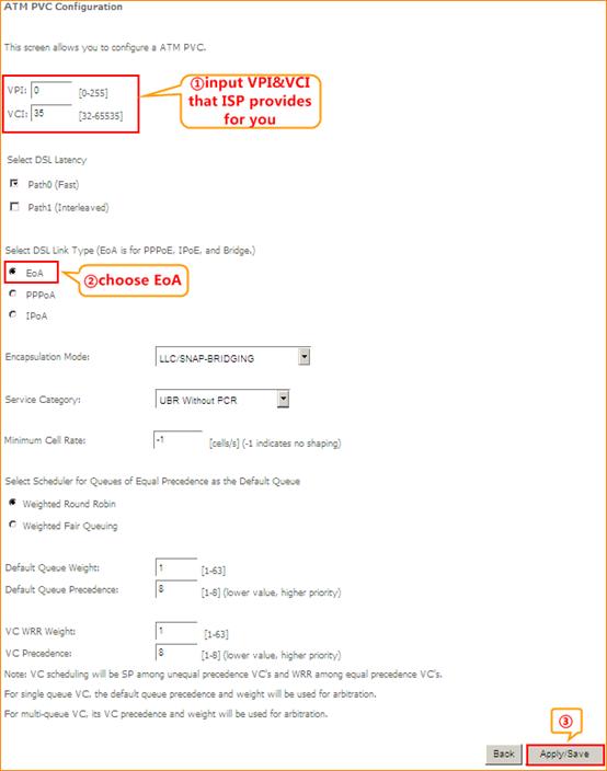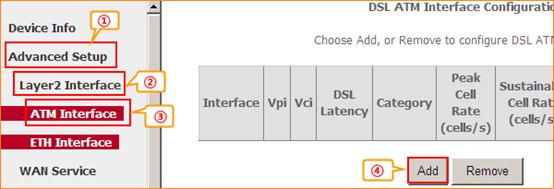 3.2.2 Click on Advanced Setup, Layer2 Interface, ATM Interface and Add. And input VPI&VCI that ISP provides for you, choose EoA, keep other default settings, click Apply/Save. Then you can see ATM Interface exists.