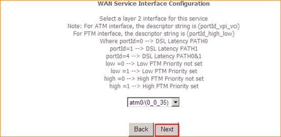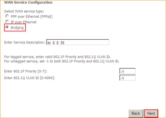 3.2.3 Click WAN Service and Add, keep the atm0 and click Next, then choose Bridging and click Next, and click Apply/Save.