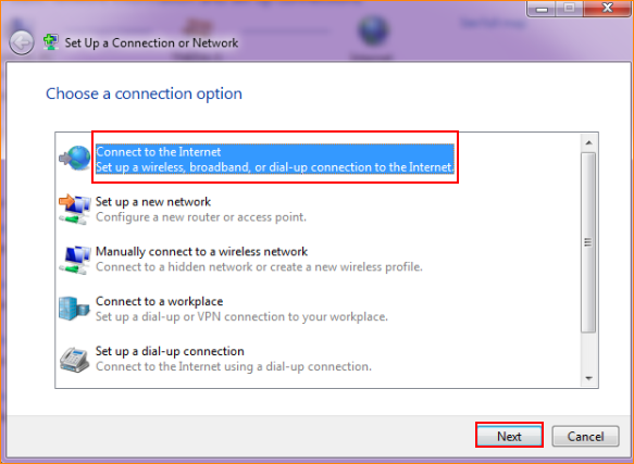 4 Click on Connect to the Internet and Next.