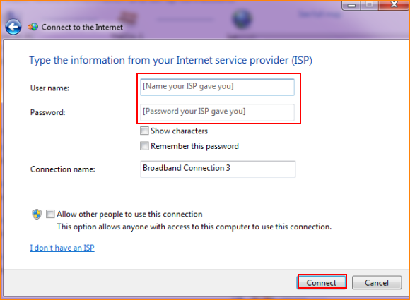 5.2.3 Input user name and password that ISP provides for you. Click Connect.