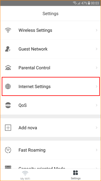 Step 1: Open Tenda APP, choose “Settings”> “Internet Settings”