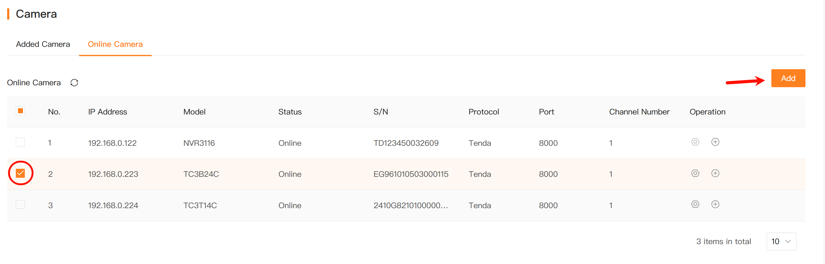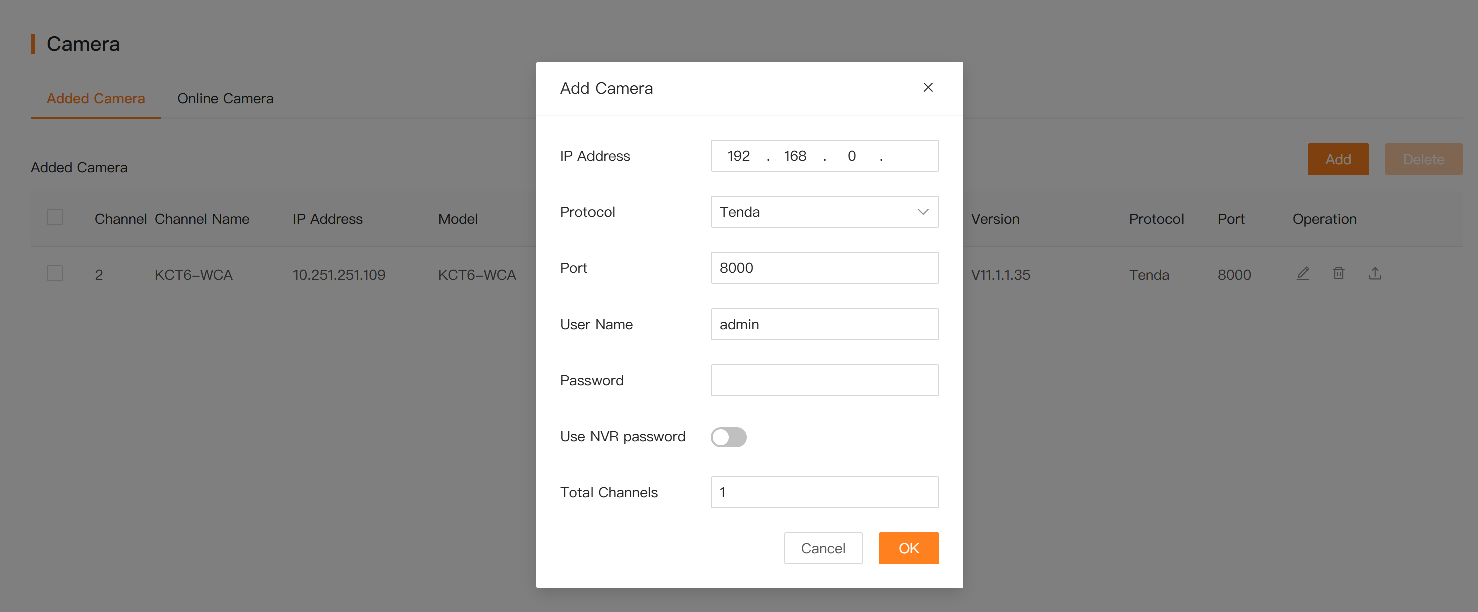 Click Added Camera, then click Add. Please fill in the IP address, protocol, port number, user name and password. If the camera displays "Online", it means it has been added successfully.