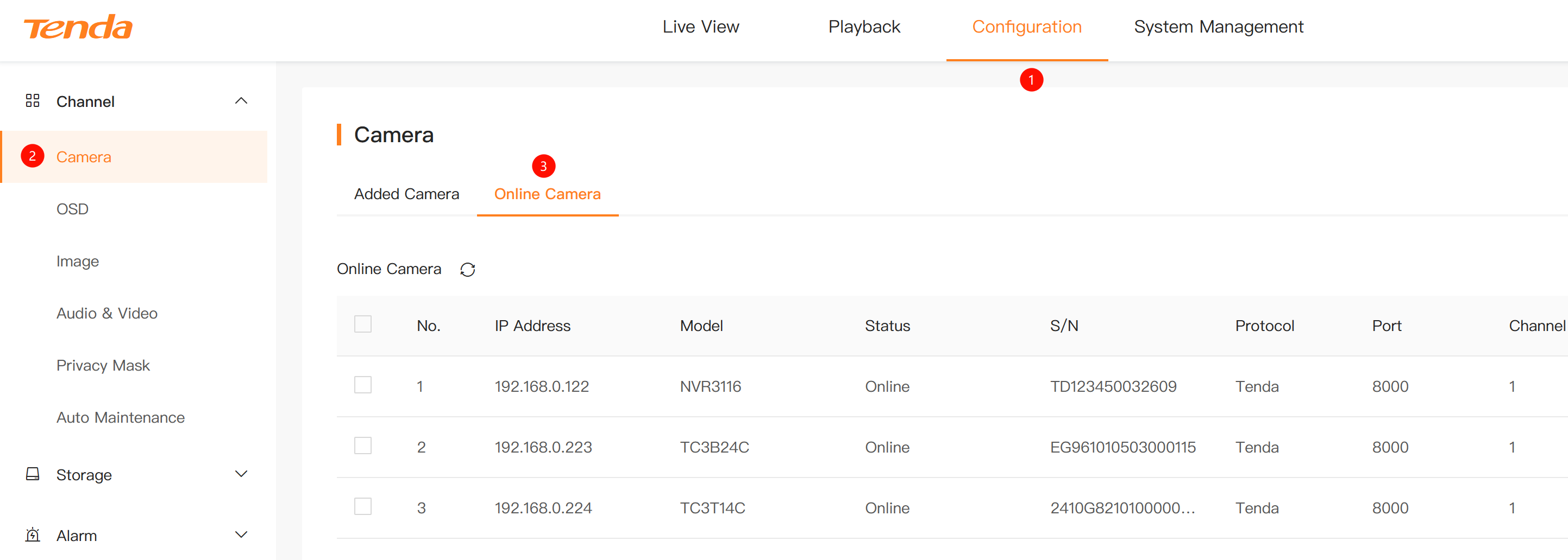 Step 2: Then go to Configure → Camera → Online Camera as shown in the picture. You can add online devices here.