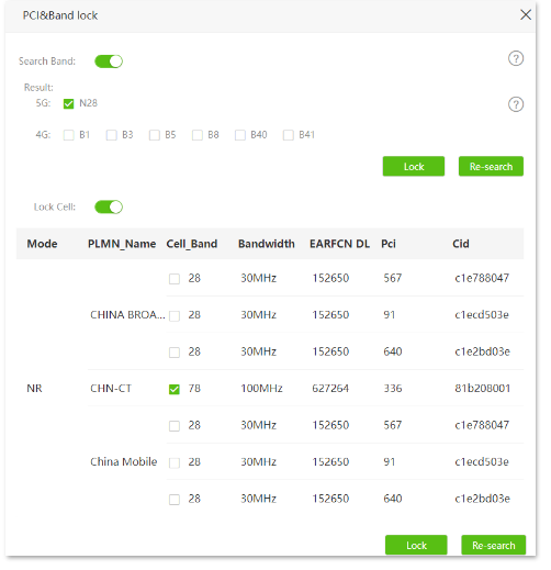 Step4: 1、navigate to Advanced Settings> PCI&Band lock; 2、Enable Search Bandand Lock Cell; 3、Select the 4G/5G frequency bandsor Cell_Bandto be locked as required; 4、Click Lock.The following figure is for reference only.---End