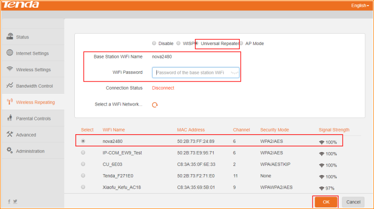 1. Tap “Universal Repeater”, select your uplink WiFi signal, type its password, and tap “OK” to save all the settings.