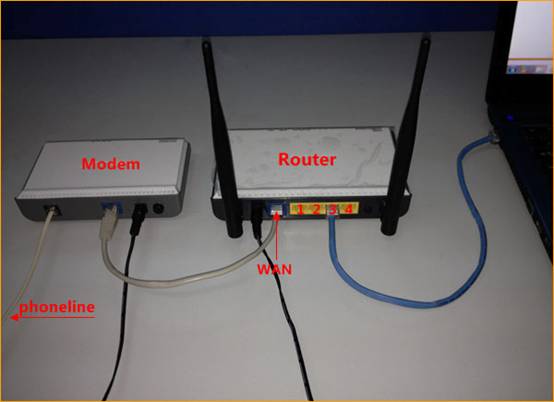 Connect the modem to the blue port of the router, then connect the router to your computer by a cable as the following picture.