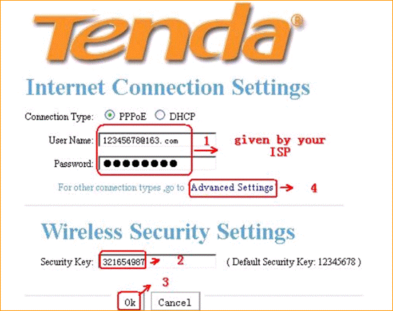 2. Choose ADSL-dial up, input the information, set a wireless password, click OK, then click Advanced Settings.