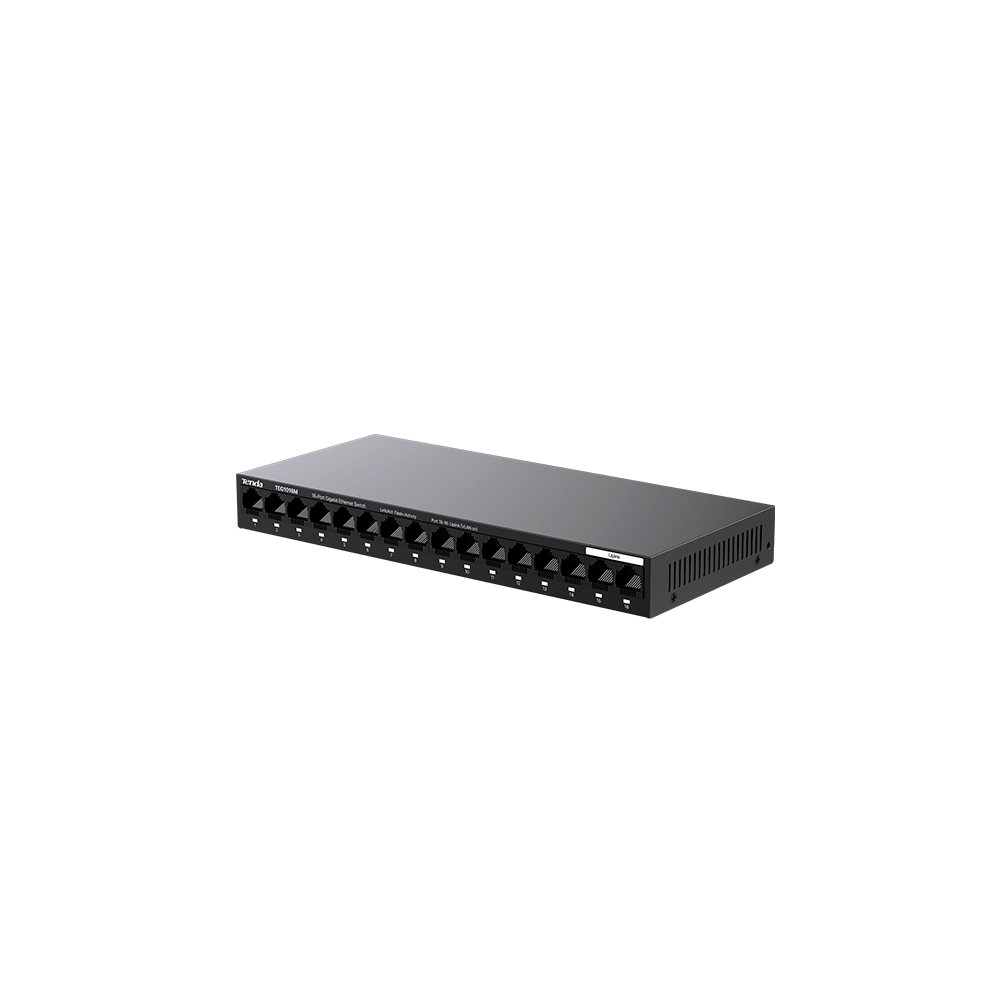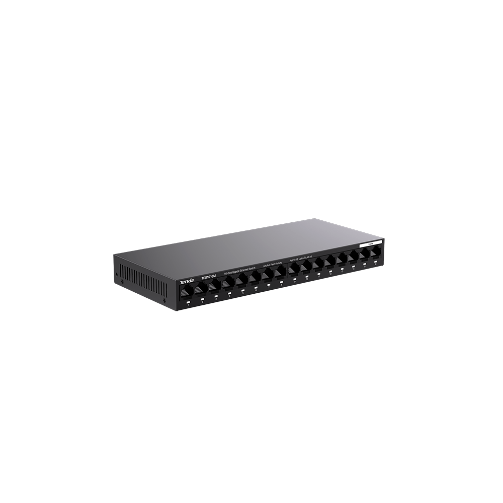 TEG1016M is a Gigabit unmanaged Ethernet switch developed by Tenda. Its full-duplex transmission rate can reach 2000 Mbps, ensuring timely transmission of large files and smoothness of videos. The switch features a mini steel shell, a fanless design, and wire-speed forwarding of all ports. It comes with a power adapter for power supply, and can connect to such network devices as computers and IP cameras. The switch also supports one-key isolation mode switching. With the advantages of plug and play functionality, easy installation and high performance, it offers a cost-effective solution for video surveillance and wired networking in such small and medium-sized scenarios as small and micro businesses, villas, and stores.
