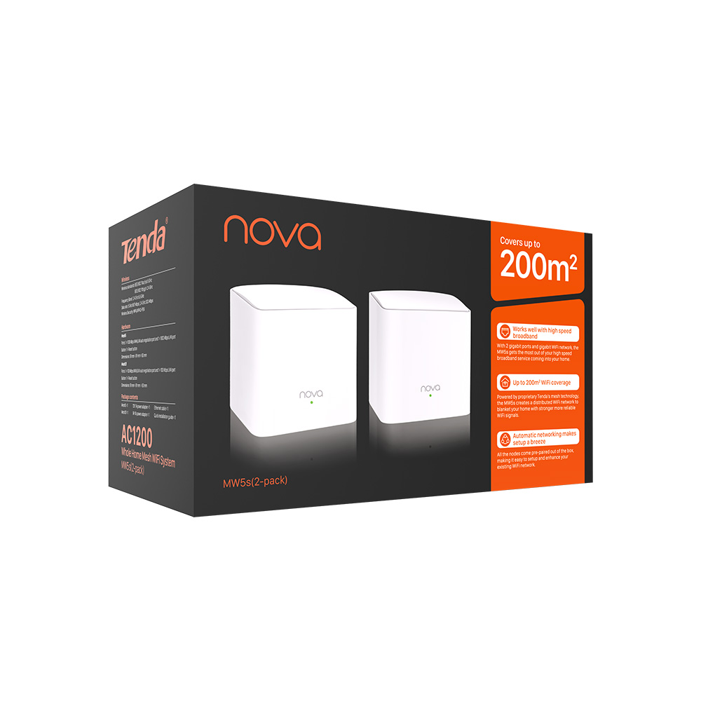 The Tenda nova MW5s is a whole home mesh WiFi system designed for larger households with 100 Mbps or greater broadband services. Powered by Tenda's mesh technology, each node automatically connects to the other, creating a distributed network throughout your entire home. The primary node features gigabit ports, getting the most out of your 100 Mbps or greater broadband service and ensuring smooth playback of 4K videos. And the wall-plug secondary node connects to your existing Mesh network automatically with pre-paired configuration, making setup a breeze.