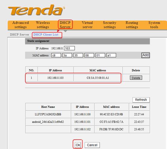 2, click DHCP ServeràDHCP client List on the top menu of the homepage. Then please add the MAC address to the list and click OK, then the computer with the MAC address will get the same IP address every time.