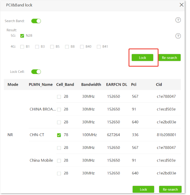 4. Select the 4G/5G frequency bandsor Cell_Bandto be locked as required.