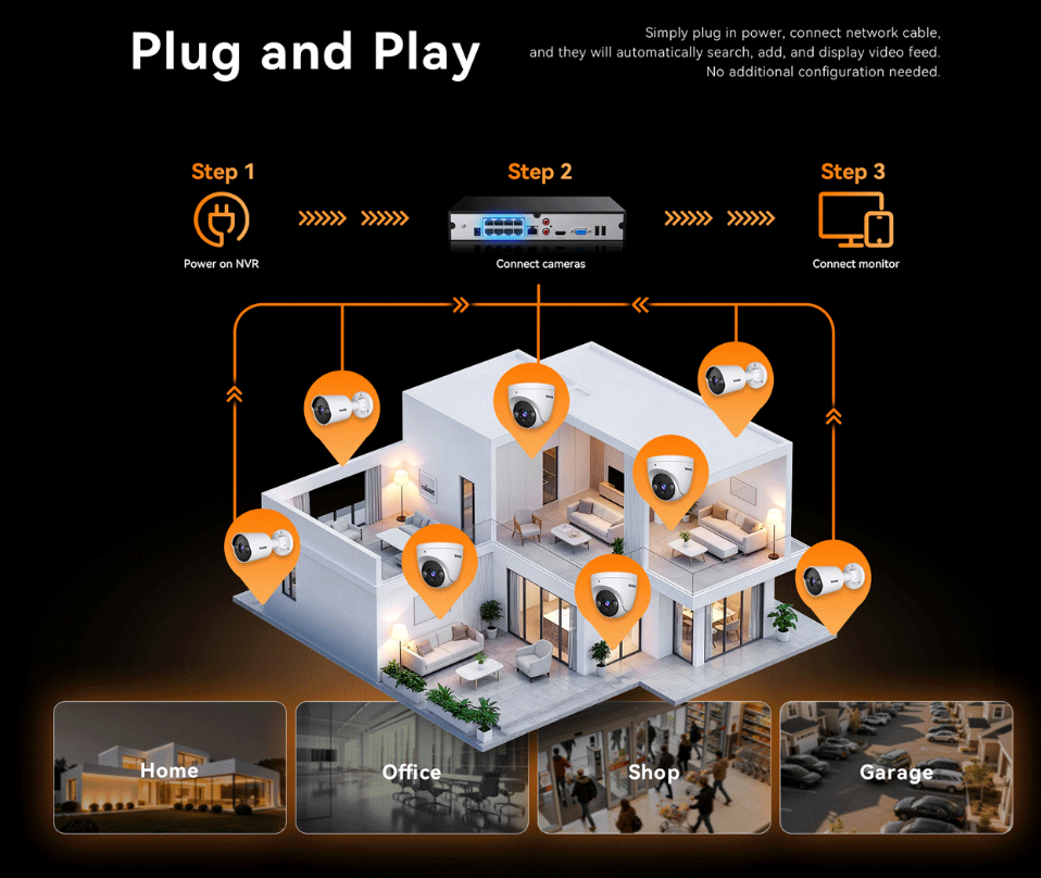 Enterprise-Grade ONVIF-Compliant PoE Security System: Integrates a 4K NVR (supports up to 10TB HDD) with 8 × 4MP HD metal weatherproof cameras (4 bullet cameras and 4 turret cameras). The system adopts IEEE 802.3af Power over Ethernet standard and H.265+ encoding technology, featuring multiple functions including plug-and-play, full-color night vision, smart HDD management, AI detection, and remote monitoring. It is suitable for various scenarios such as stores, garages, factories, indoor/outdoor homes, and offices. Complete with all accessories for easy installation