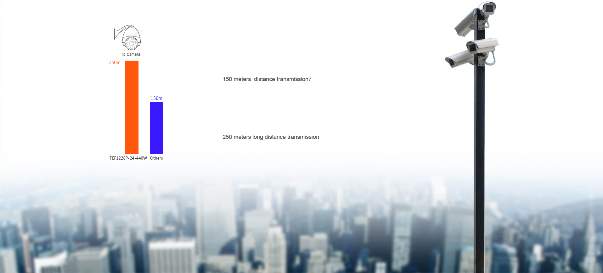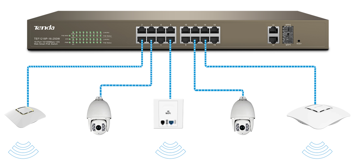 Din cauza mediului unde sunt ansamblate camerele, cablajul lor poate să difere de la una la cealaltă, de la o variație de un metru până la kilometri întregi. Seria Tenda TEF12 Poe suportă până la 250 de metri de cablu ce transmite date în conexiune încrucișată, iar în paralel poate ajunge la câteva sute de metri. De asemenea, are porturi Gigabit care pot transmite viteze mari, până la câte zeci de kilometri distanță.